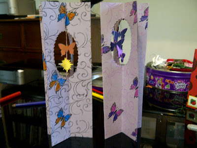 | The butterfly dangles are punched out of coloured vellum and stuck together with a piece of silver thread between them. |